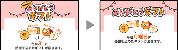2026年4月6日(月)より、「ありがとうギフト」のお届けが毎月1回(毎月3日ご提供)から、毎週1回(毎週月曜10:00ご提供)に変わります。お届けの頻度があがり、より多くのギフトを受け取れるようになります。
