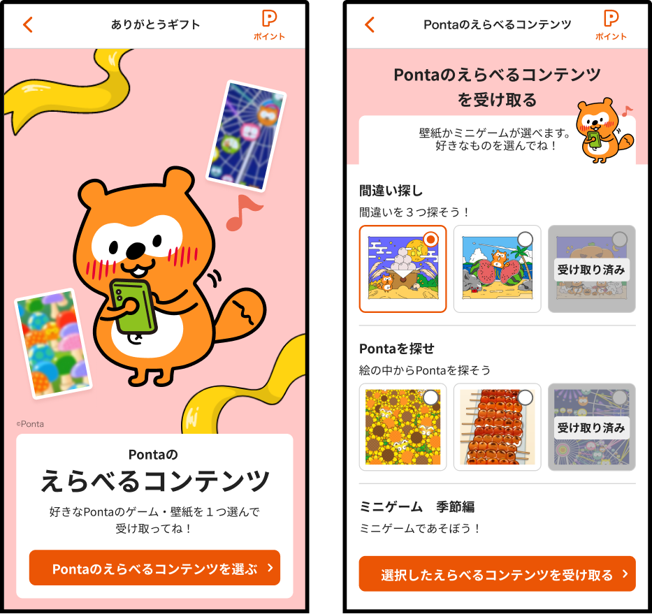 ありがとうギフトで「Pontaのえらべるコンテンツ」に当選すると、Pontaの壁紙やミニゲームから好きなものを1つ選べるようになります。ここでしか見られないPontaに出会えるかも?