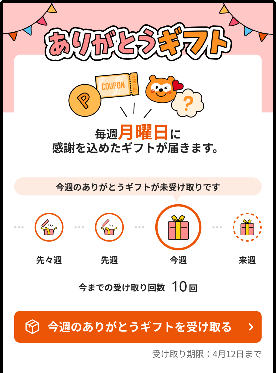 日頃のご利用に感謝を込めて、「ありがとうギフト」をお届けしています。ポイントやクーポンなど、ギフトの中身は開けてからのお楽しみ。